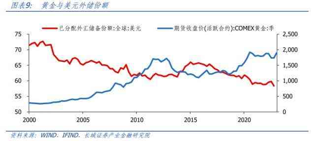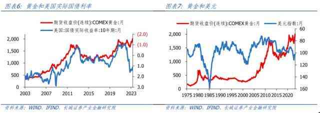 黄金与四国CPI指数(中美欧日)的走势大致相似。2000年至2011年四国CPI持续上升,也即全球物价持续上扬,黄金价格也伴随上涨。2011年之后全球经济进入低增长、低通胀和低利率环境,黄金价格也跟着震荡走低。2015年之后随着中国传统产业的供给侧改革结束以及新一轮房地产上涨周期的开启,全球物价又出现新的上涨,黄金价格也跟着见底回升,直到2019年之后加速上涨。自从2022年10月美元见顶回落之后,四国CPI指数再次反弹,黄金价格同时反弹。