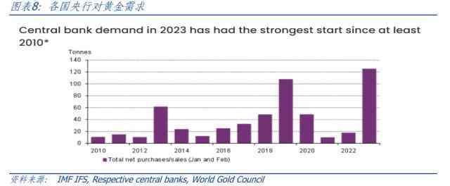 这个第三方因素就是各国央行。根据世界黄金协会的数据,2月份全球黄金储备增加了52 吨,已是连续第 11个月净购买。其中,土耳其央行2月增持了22吨黄金,已是连续15个月增持黄金;同时,乌兹别克斯坦央行、新加坡和印度储备银行也增持了黄金。4月7日,中国外汇管理局数据显示,截至2023年3月末,我国黄金储备达6650万盎司,较上个月增加58万盎司。