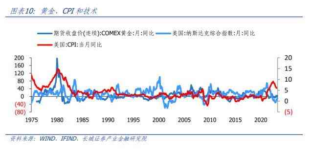 另外,科技新浪潮会影响黄金牛市的表现。今年以来AI技术表现亮眼,数据资源、运算能力、核心算法共同发展,掀起人工智能第三次新浪潮。人工智能作为新一轮产业变革的核心驱动力,将催生新的技术、产品、产业、业态、模式,从而引发经济结构的重大变革,实现社会生产力的整体提升。这轮人工智能掀起的科技浪潮,有可能是继2000年互联网科技浪潮、2010年智能手机浪潮之后的第三波。生产力的大幅提升会产生抑制通胀的作用,因此1995-2000年网络泡沫时期和2012-2017年智能手机大发展时期通胀均较低,黄金价格都是下降的。这一次也可能影响黄金价格。