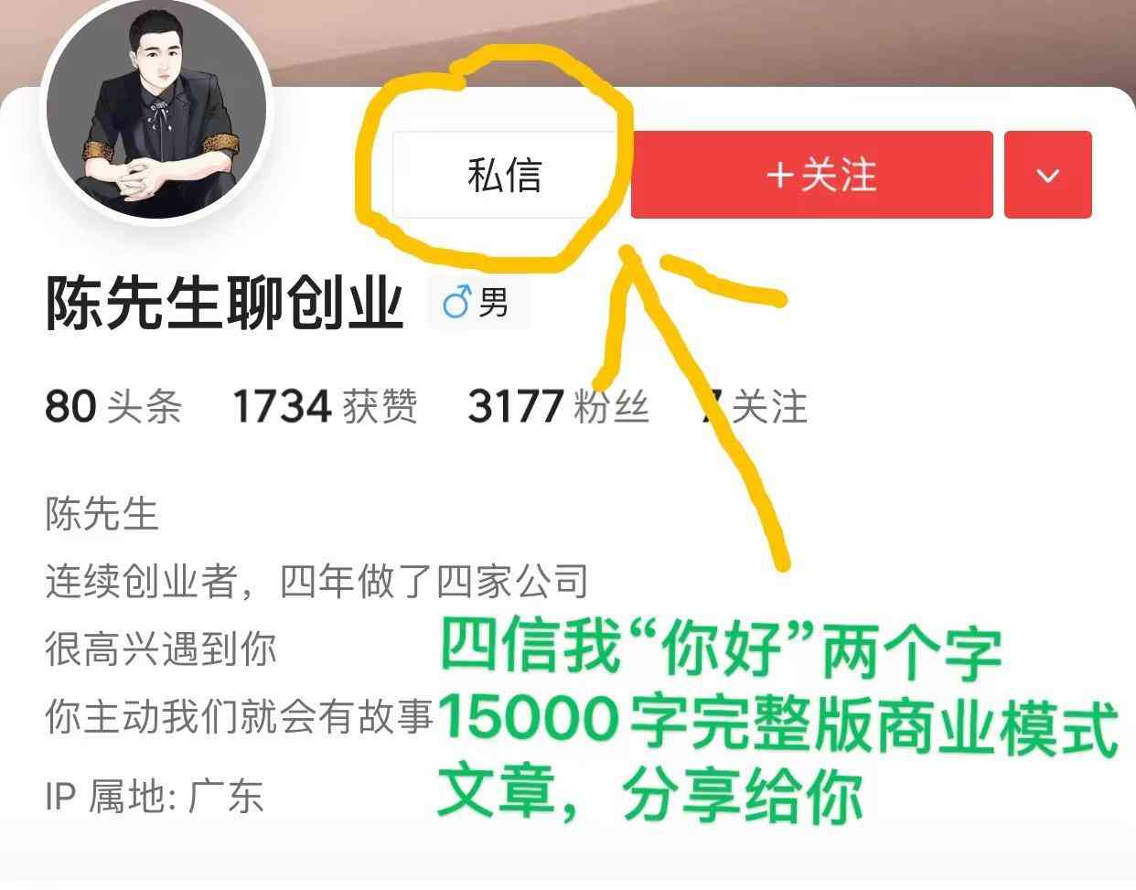 你看,到这里,你就有机会,给他发出了你的个人简介,你看,这就是人设的树立了。