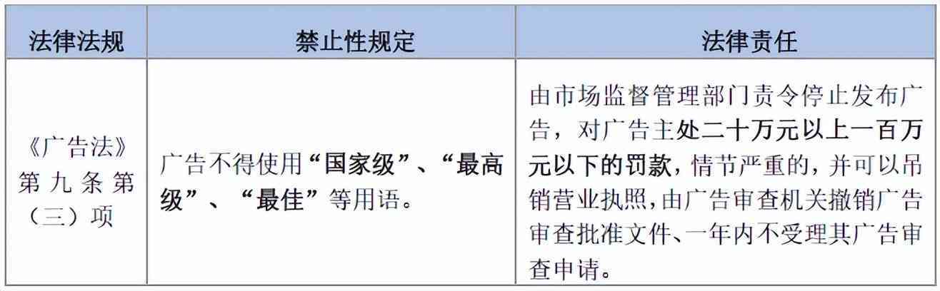 根据《中华人民共和国广告法》(以下简称《广告法》)第九条第(三)项的规定,广告不得使用“”、“”、“最佳”等用语,此项规定构成了实践中绝对化用语违法情形的执法依据。绝对化用语的禁止性规范旨在防止经营者使用此类非客观的描述对消费者进行错误暗示或引导,违反者可能承担如下行政责任: