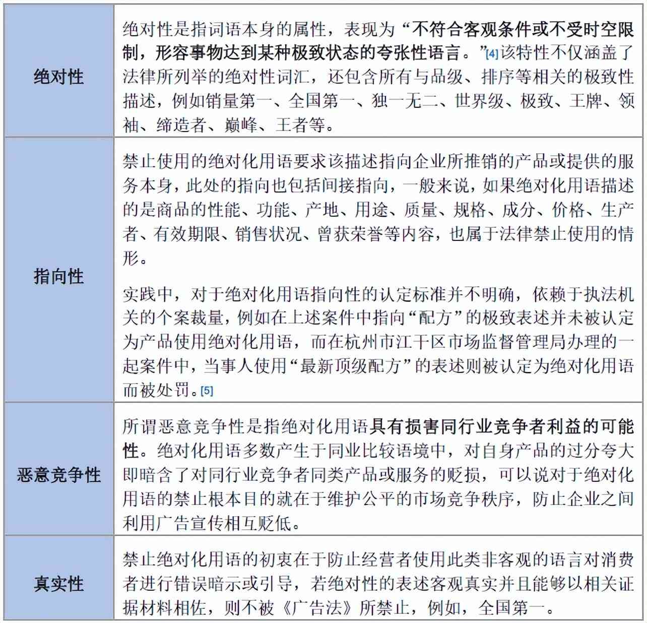 由于法律条文的简洁性以及中文词语语义的多样性和复杂性,造成实践当中对于绝对化用语的判定难以把握,是否构成绝对化用语应当以《广告法》对广告内容的原则性规定为基本依据,结合广告词语的词性、指向性、真实性等特性进行综合考量: