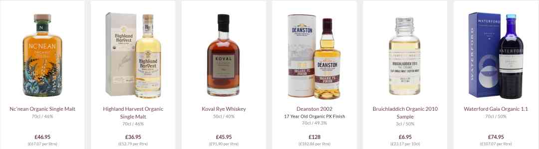 生产有机威士忌的酒厂中,比较知名的有:本诺曼克(Benromach)、沃特福(Waterford)、汀思图(Deanston)和Nc'Nean这几家。除了苏格兰和爱尔兰,还有美国、法国、瑞典等国家的几家酒厂也推出过有机威士忌产品。