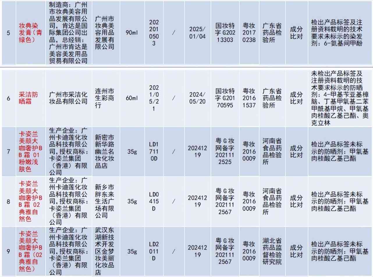 广州市妆典美容用品发展有限公司制造的妆典染发膏(绿色)、妆典染发膏(青绿色),成分比对不合格;