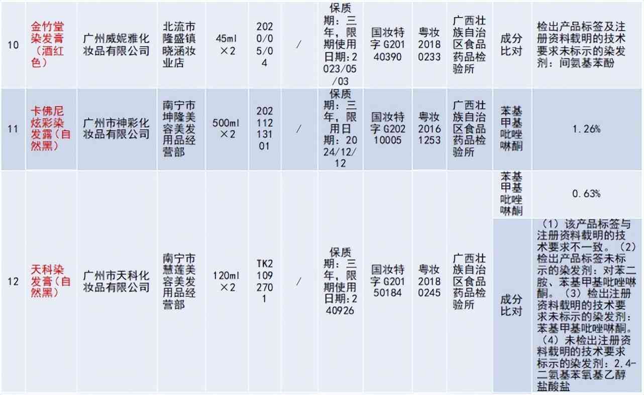 广州威妮雅化妆品有限公司生产的金竹堂染发膏(酒红色),成分比对不合格;