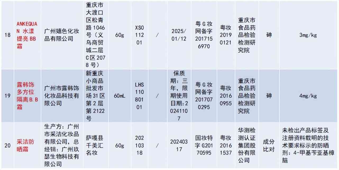 广州嬉色化妆品有限公司生产的ANKEQUAN 水漾提亮BB霜,被检出砷(3mg/kg);