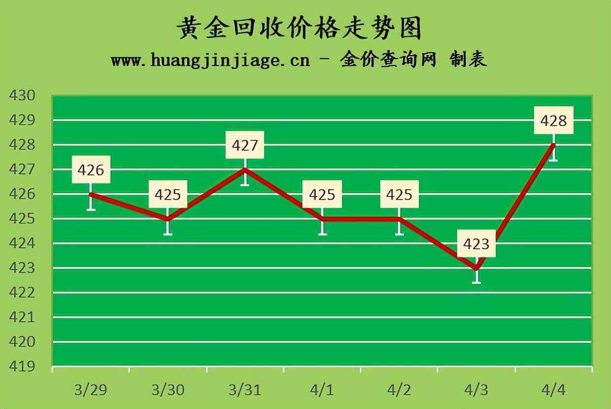 黄金回收价格428元/克,铂金回收价格192元/克,钯金回收价格293元/克,18K金回收价格306元/克,银条回收价格4元/克。(黄金行情是波动的,回收金价没有固定标准。)