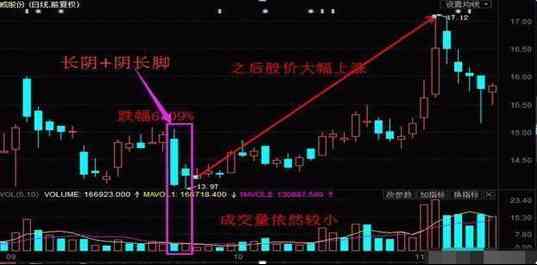 3、 大阴+阴长脚,这两个交易日当中,如果成交量相对较小,那么后期股价上涨的概率就会更大。如果成交量相对较大,则后期股价上涨的概率没有前一种情况的概率大。(当然一般情况下,形成大阴线不太可能伴随很小的成交量)