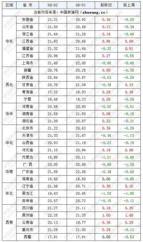 猪价下跌地区(18个):安徽省、浙江省、福建省、江苏省、陕西省、甘肃省、青海省、宁夏回族自治区、湖南省、湖北省、天津市、山西省、内蒙古自治区、广西壮族自治区、广东省、辽宁省、吉林省、西藏自治区;下跌区间为0.01-1.68元/公斤;
