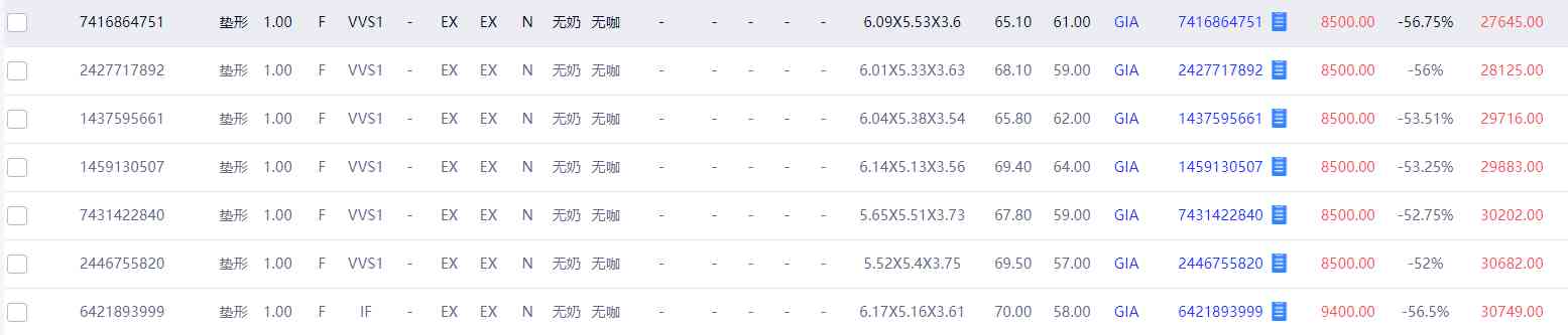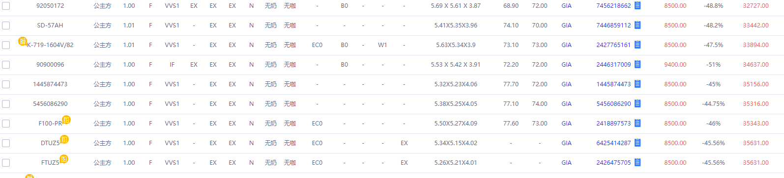 公主方形钻石VS垫形钻石价格表如下(1克拉大小):