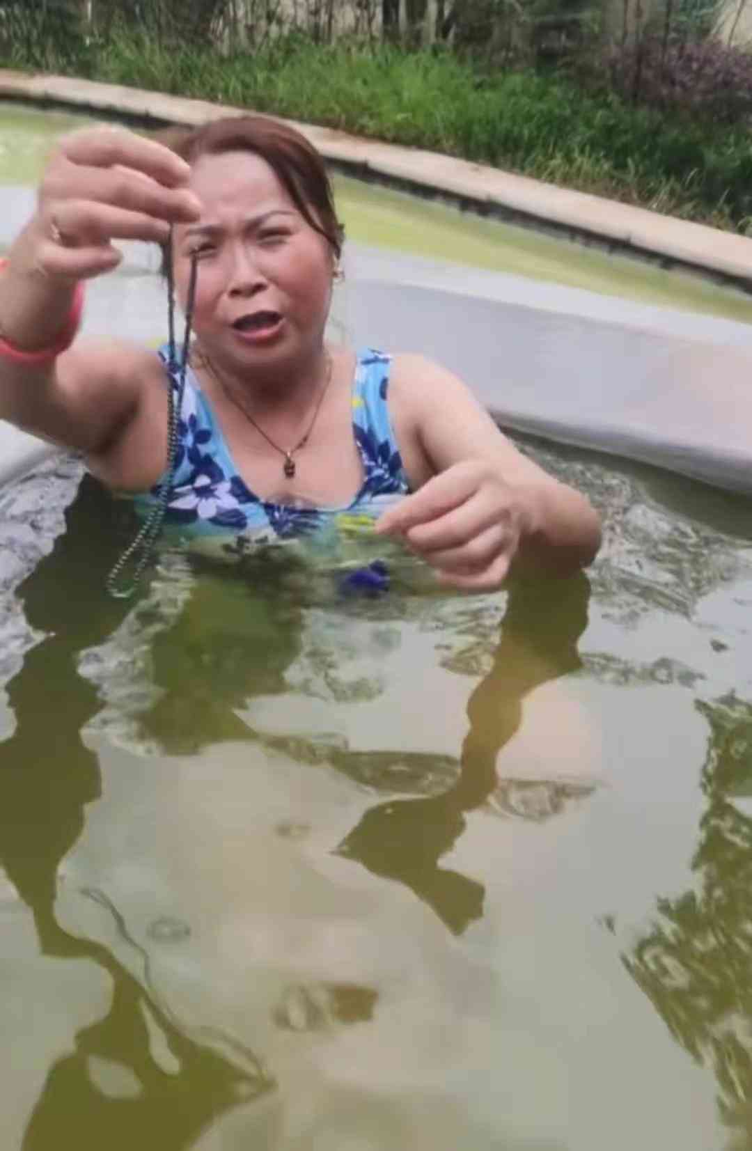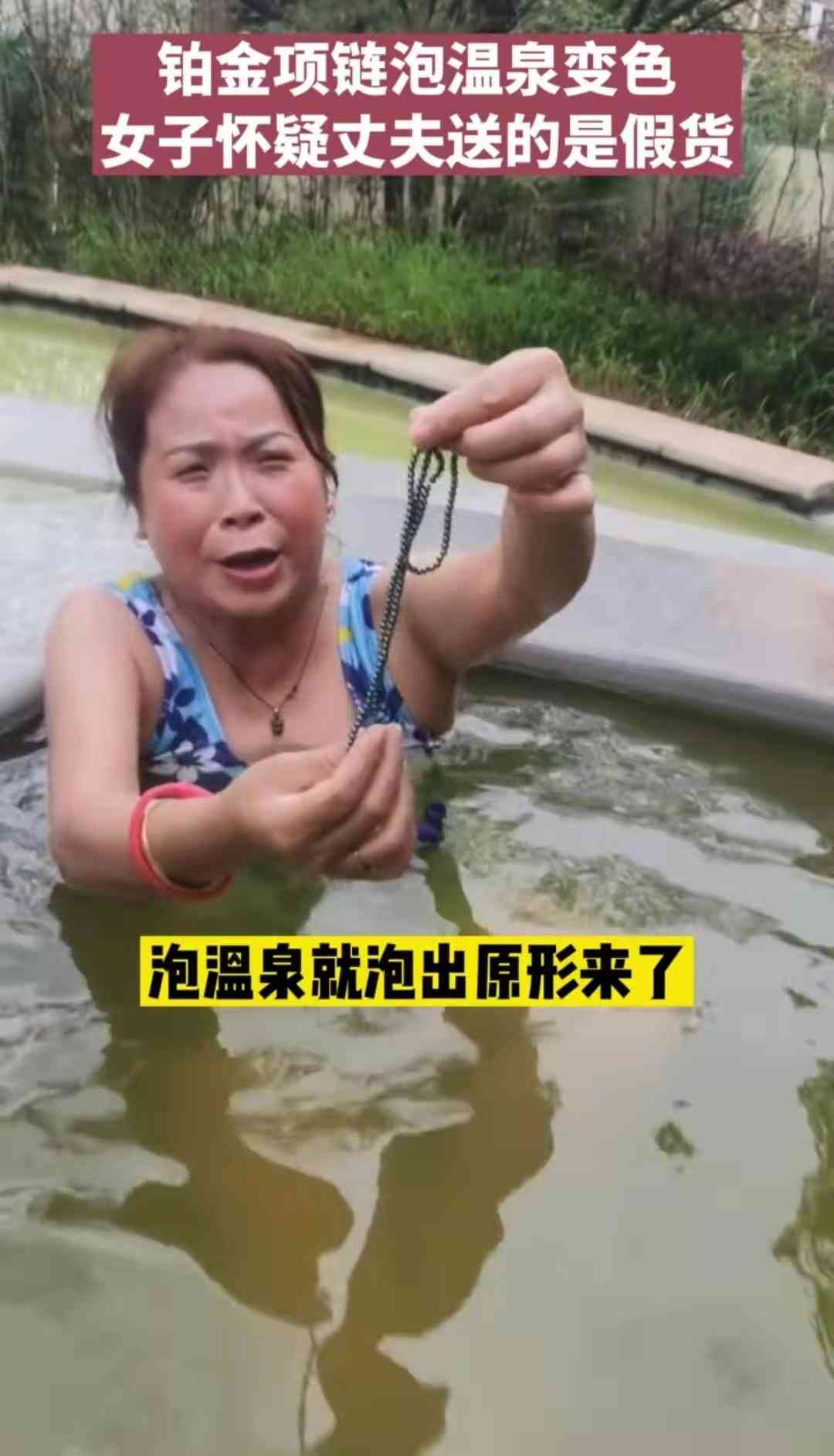 那不巧的事情发生了,她在泡温泉的时候没有摘下这些首饰,导致她的铂金项链变色了,这下尴尬至极,本来想的给姐妹们炫耀一下自己金光闪闪的首饰,没想到会变色。而且这条铂金项链是丈夫买给自己的,大妈直呼:你看嘛,拿个假的把我骗了,今天来这里,泡温泉就泡出原形了。大妈的这几句话缓解了一下尴尬的场面。
