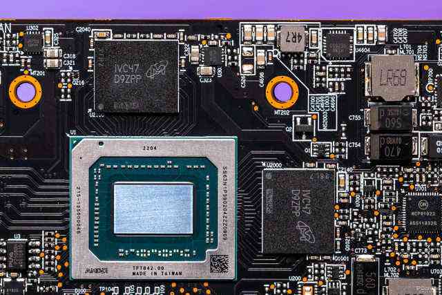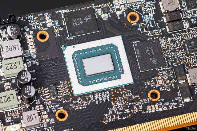 核心旁是两颗来自美光的GDDR6显存颗粒,FBGA编号为IVC47-D9ZPP,单颗显存容量为2GB。
