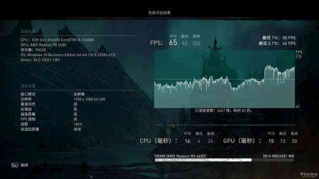 考虑到RX6400的性能,我们选取了10款对显卡性能不同要求的游戏,统一在1080P分辨率下进行benchmark测试,不开启光线追踪和FSR,关闭垂直同步,默认高画质,部分游戏由于对显存容量具有一定要求,为了避免爆显存产生帧数瓶颈,有三款游戏会降低画质进行测试。