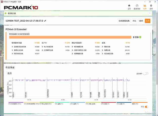 日常体验部分,我们对显卡进行PCMark10Extended基准测试,测试内容包括常用基本功能、生产力、数位内容创作以及游戏四部分,基于实际应用和活动的测试来衡量PC性能,包括浏览网站,视频聊天,编写和电子表格,编辑照片和视频以及玩游戏等日常任务的一系列性能测试。