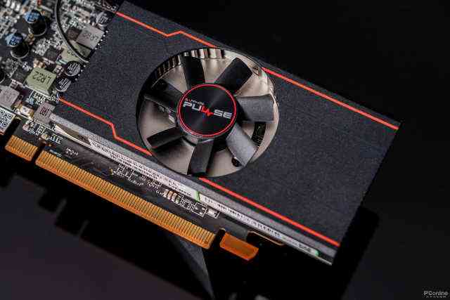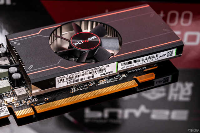 显卡外形为单槽半高设计,整体外形小巧,PCB上方为散热模组,采用蓝宝石白金系列的黑红配色外观,模组由底部四颗螺丝固定。