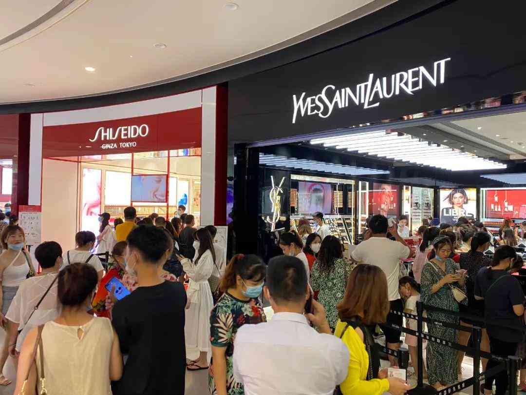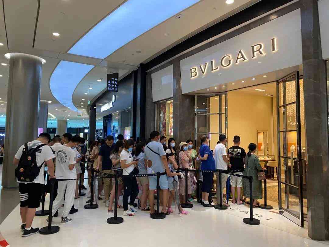 记者在海南三亚海棠湾的三亚国际免税城看到,上午10时30分左右,该免税城的两栋楼内已经人头攒动。在B区的钟表/珠宝/精品区,一些热门品牌如蒂芙尼(Tiffany)、宝格丽(Bvlgari)、普拉达(Prada)等已经开始排队;而在属于国际精品/美容及个人护理的A区,则已经人声鼎沸。