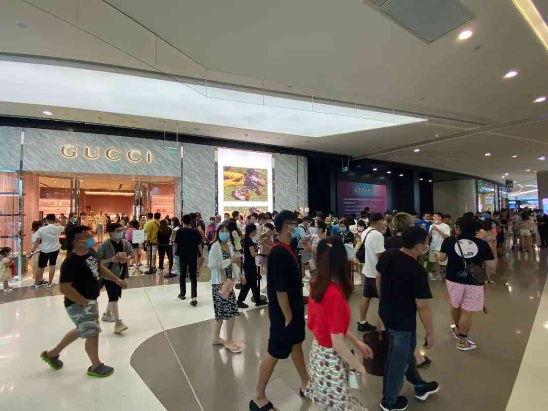 13时左右,记者看到,免税城内的人更多了,一些此前没有排队的门店也开始排起了长队,而此前已经在排队的门店排队人数也增加了不少。其中,现场最为“火爆”的是古驰门店。门口的保安告诉记者,从排队到进入门店大约需要一个半小时。