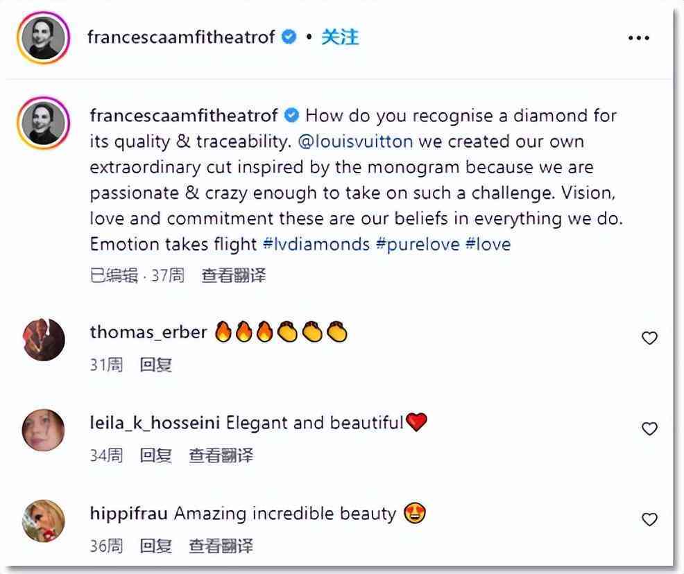 B Blossom、LV VOLT系列就是她加入LV的代表作,凭借活力不失俏皮的风格戳中不少年轻人的心。这次LV Diamonds系列刚一发布,同样收获无数好评,粉丝们都在她的INS下直呼“Elegant”,“Beautiful”↓