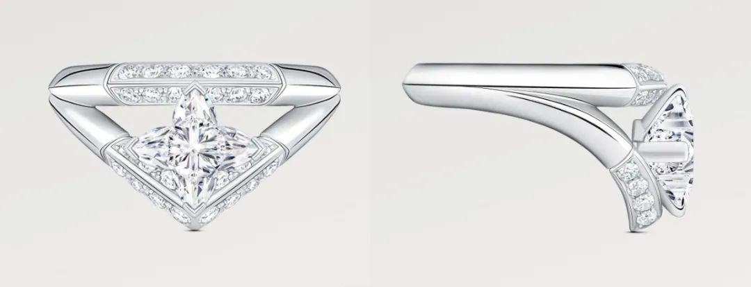 另外这款Pavé Double Ring更有存在感。正面看是三角形结构,V字弧线清晰可见,侧面看像延伸出了另一个平面,加上Monogram星形切割主钻的烘托,显得立体感十足,戒圈上更点缀了一颗颗闪耀的钻石,增添华丽效果。