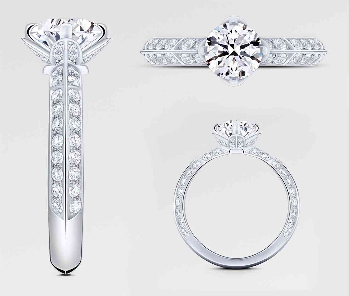 和前面的Monogram星形切割钻石款一样,这枚明亮圆形切割钻石戒指同样有Pavé Solitaire和Solitaire两款可选,一款辅钻较多,另一款相对更简约。