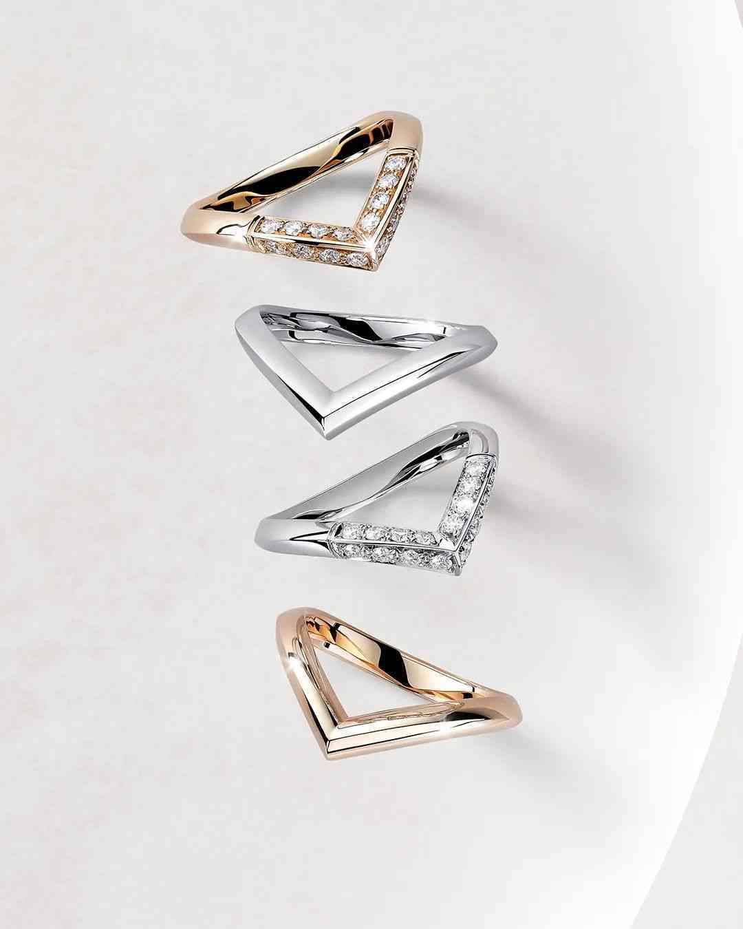 戒指分别有18K玫瑰金和铂金950材质,除了外圈镶钻的Pavé V Ring之外,还有里圈镶嵌一颗小钻的简约V Ring。随便拿出一款都有着极强的造型感,一上手就赢面很大。买来犒赏一下自己,不失为一款走心珠宝~