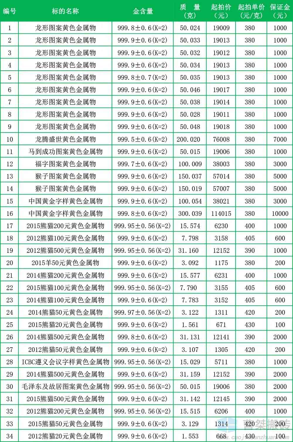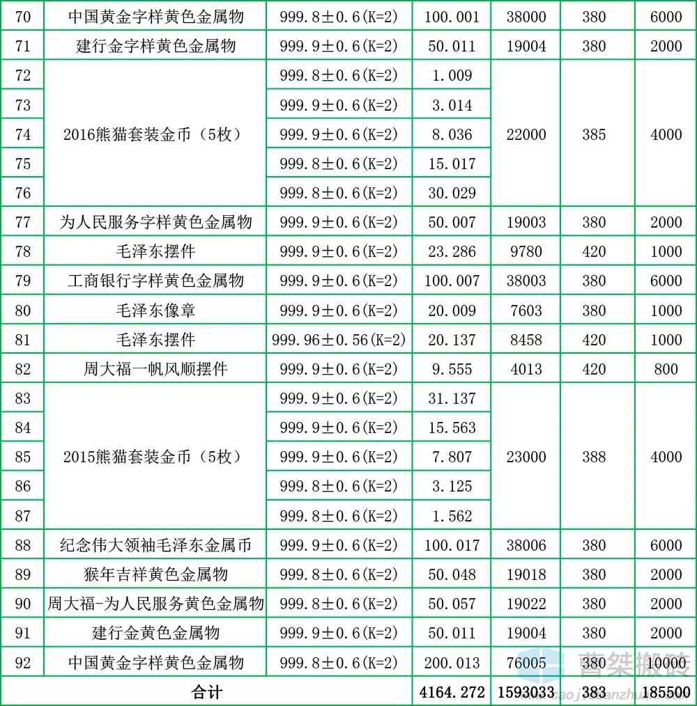 本次拍卖拍卖标的含金条、纪念币、饰品、摆件等共计92件,其中53根金条起拍单价380元/克,纪念币起拍单价380-430元/克,摆件起拍单价420元/克,饰品起拍单价521元/克(饰品仅有一件)。