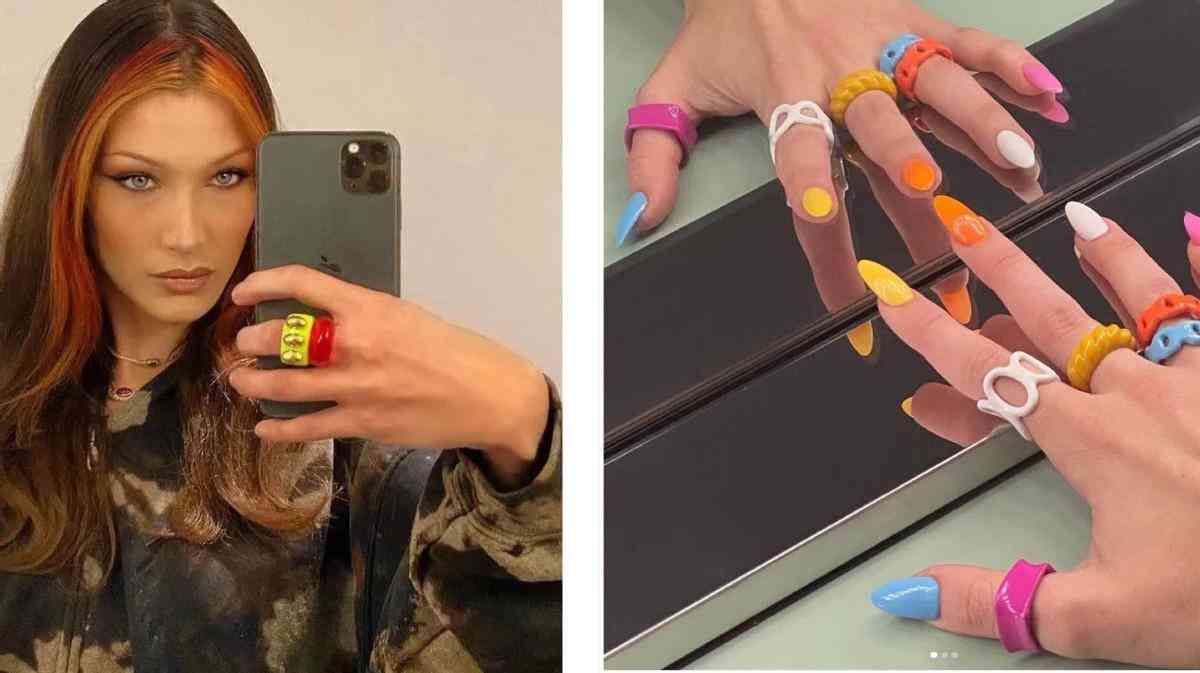 而在佩戴的时候,比起单独佩戴,最合适的方式还是这种叠戴的搭配,几个塑料彩色的戒指或者是叠戴在一只手指上,或者是像印章戒指一样戴在所有的手指上,搭配颜色绚丽的美甲造型,更可以让整身的风格完美很多。