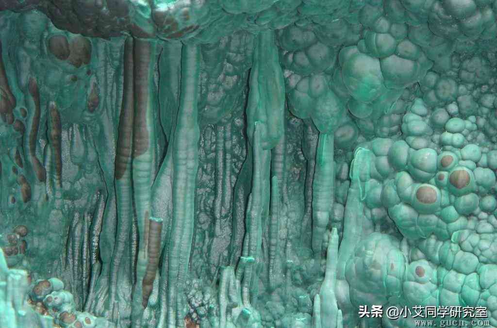 还记得下面这张图片吗?这是孔雀石钟乳状以及葡萄状集合体,孔雀石主要形成在铜矿床的氧化带中,原生的含铜的硫化物,通过氧化作用溶于水,然后通过淋滤作用,最终经过化学沉淀形成的。