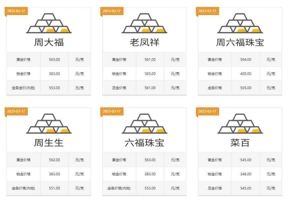 2. 选择合适的品牌和渠道。不同品牌和渠道的黄金首饰价格可能会有较大差异。一般来说,知名品牌和正规渠道的黄金首饰质量更有保障,但也可能收取更高的加工费和服务费。比如今天的大品牌金价分别是周大福黄金价格是563元每克、老凤祥561元每克、周六福珠宝564元每克,这些金价其实都会比小品牌贵上50元左右每克。如果想要节省成本,可以选择一些中小型品牌或者网上平台购买。