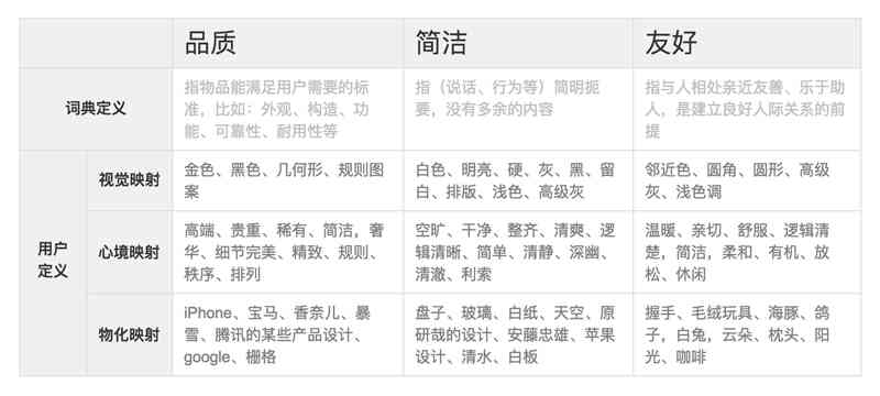 心境映射可以理解为联想到的心境感受,比如:品质——高端、贵重、稀有;简洁——空旷、干净、整齐;友好——温暖、亲切、舒服等。