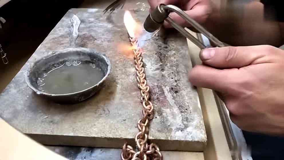那板上有一个已经烧过的凹坑,把金子放在凹坑中,再用吹氧的火枪来烧熔黄金。烧熔后把黄金倒入已经选好的首饰模型中(石膏制成),再用黄泥巴来压模。压完后,待一阵子,马上把黄泥和石膏敲开取出已成型的黄金首饰,放入硝酸溶液中清洗一下,最后用抛光机抛光,这样金银匠完成作业之后再把首饰放到天平秤上去再秤一次,前后的重量可以说是分好不差.。然后顾客心满意足十分放心的戴着新打好的金首饰走了。