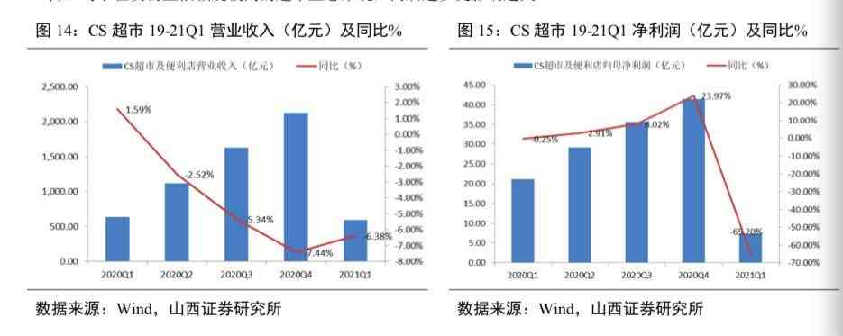 受社区团购影响的不止永辉一家。山西证券研究所5月14日发布的研报指出,我国零售行业一季度持续回暖,但样本为13家上市超市板块的公司在 2020 年下半年开始业绩下滑情况较为明显, 2021Q1,样本13家上市超市公司整体归母净利润 7.34 亿元,同比 20Q1 下降 65.20%,同比 19Q1 下降 65.29%,两年复合增速下降 41.08%。而天风证券以红旗连锁、永辉超市等11家上市超市为样本的调查则显示,从2020年季度到2021年季度,整体营收也持续下行,2021年季度为-8.7%。