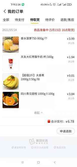 记者日前在某社区团购平台新注册用户,随即购买了一些生鲜商品:一个近2斤重的菠萝、一瓶酸奶、2斤香蕉和2斤甜橙,总共花费6.78元,这个价格远低于周围菜市场和生活超市的售价。其中,作为新注册用户的福利,2斤香蕉作价仅1分钱。