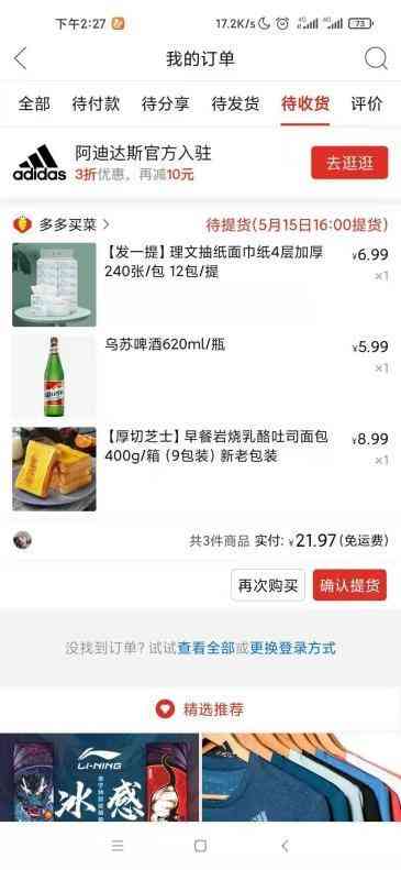 订单上显示,社区团购中这瓶酒售价5.99元,而记者通过“XX到家”搜索周围几公里内各大生活超市620ml乌苏啤酒,发现其零售价都在8.9元以上;而在天猫和京东的乌苏啤酒官方旗舰店中,优惠后的价格也远高于5.99元。一位社区便利店负责人透露,这瓶乌苏啤酒他的进货价都在7.5元,卖9元。由此可见,某些社区团购的价格确实明显碾压许多实体生活超市甚至线上超市。
