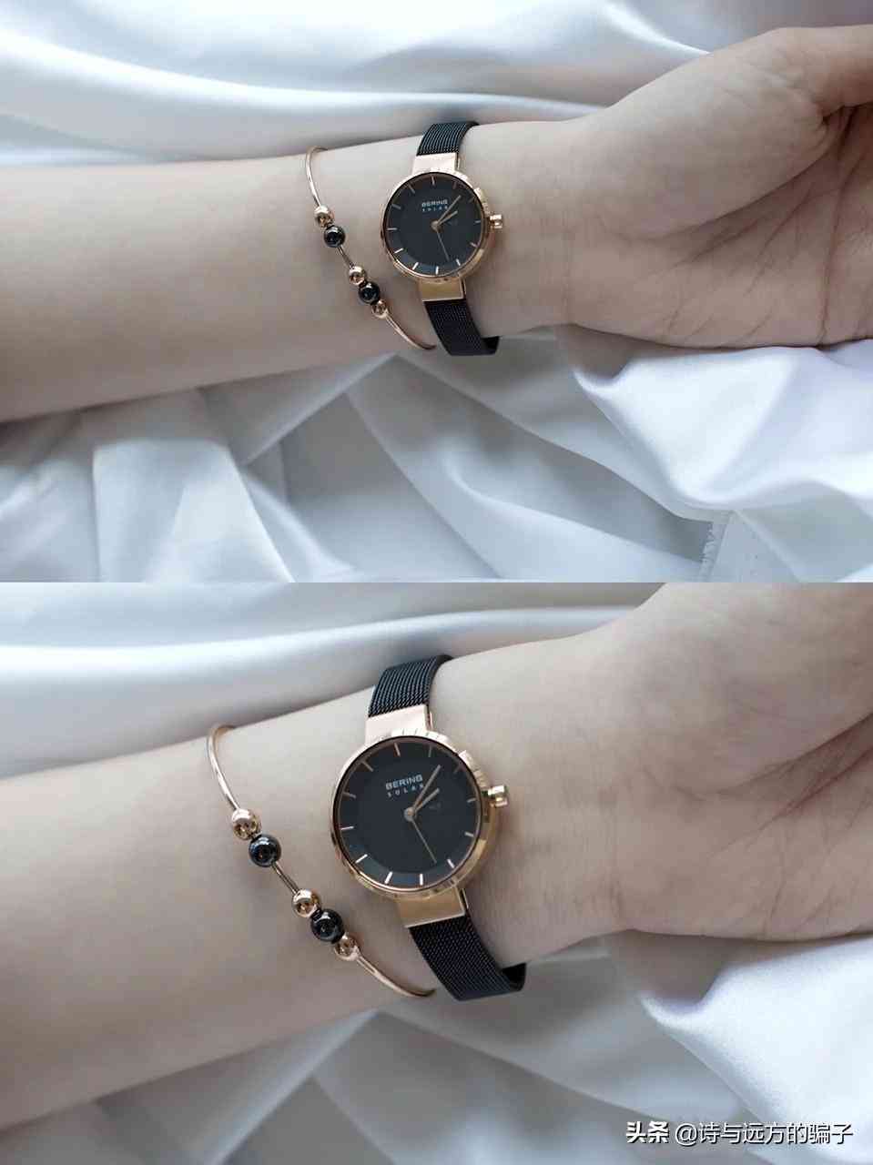 另外,除了单独与黄金手饰搭配以外,小仙女们还可以尝试加入其他材质的手腕饰品,比如手绳等等,不同材质风格的混搭碰撞,更突显独具一格的时尚品味的同时,也能让比较普通或者大众化的手表款式