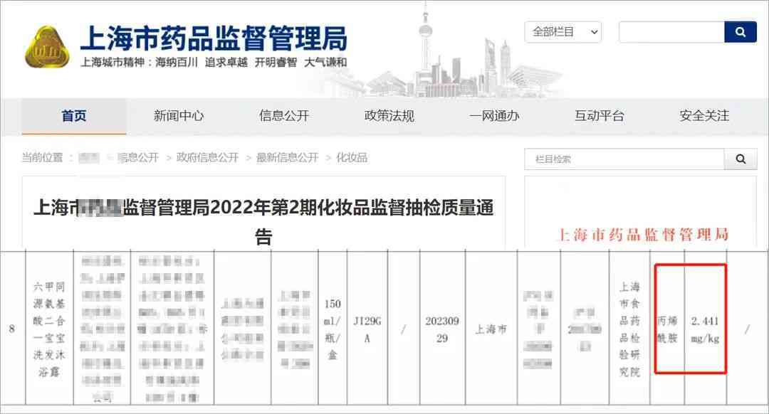 另外这段时间,我们还发现有通告说:有洗沐一体中,丙烯酰胺的含量超标 5 倍多!