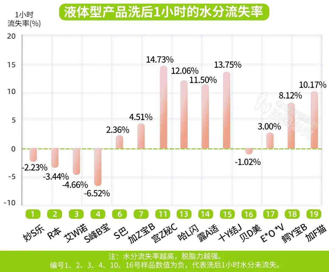 为了更加准确地对比,我们委托实验室,测了 19 款样品洗后1小时内的水分流失率。
