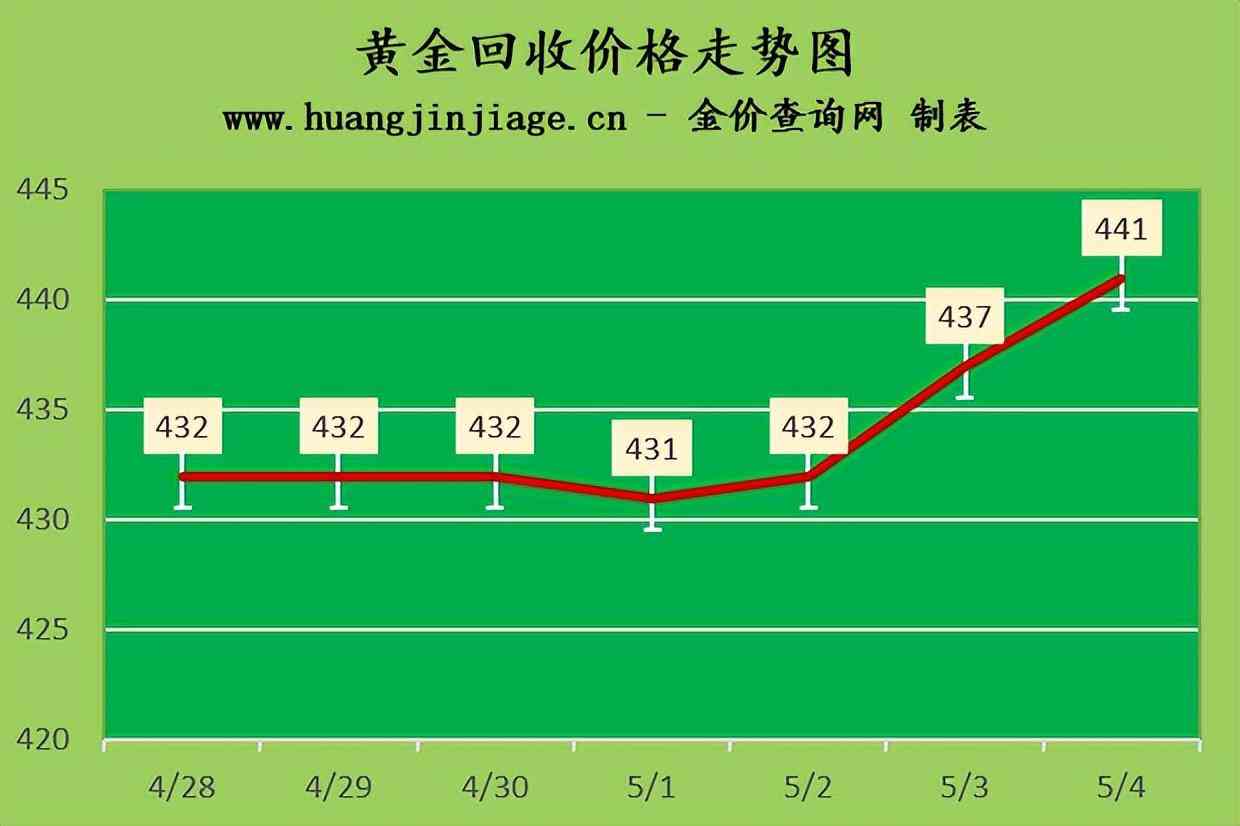 黄金回收价格441元/克,铂金回收价格207元/克,钯金回收价格297元/克,18K金回收价格315元/克,银条回收价格4.4元/克。(黄金行情是波动的,回收金价没有固定标准。)