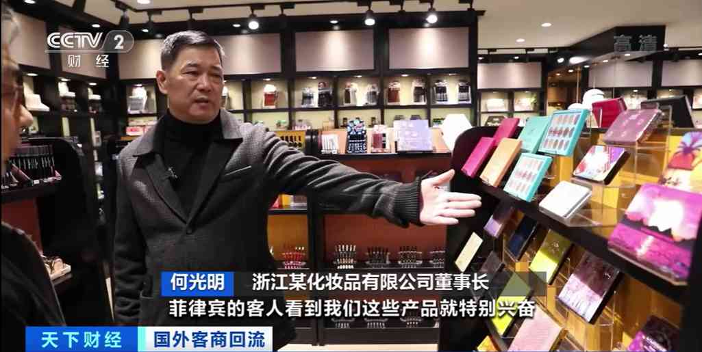 浙江某化妆品有限公司董事长 何光明:菲律宾的客人看到这些产品非常兴奋。对于我们来说,这次出去机会增加了,抢到了很多东南亚的优质客户。