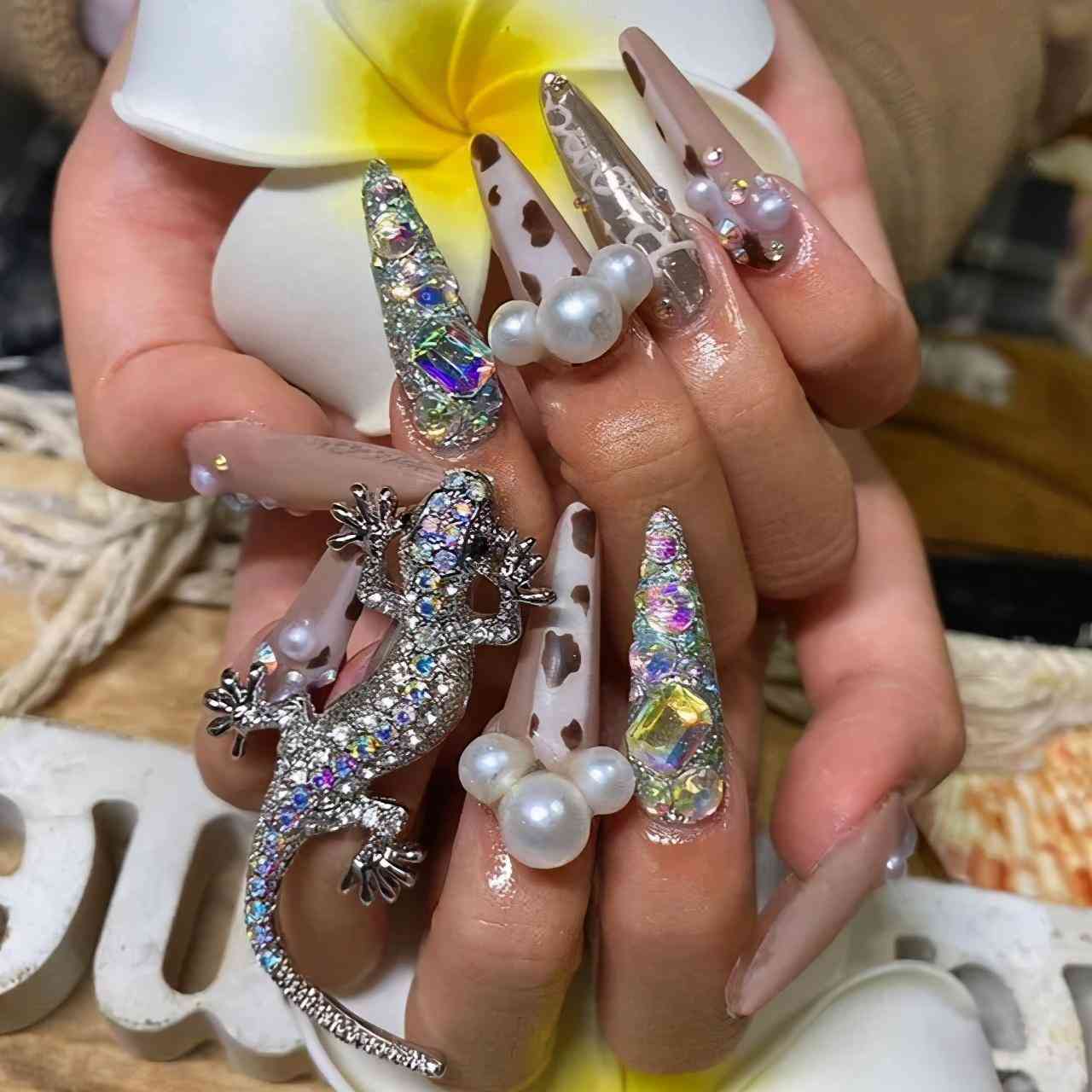 她长长的假指甲上贴有壁虎、珍珠和宝石等装饰,blingbling非常耀眼。网友们忍不住吐槽,这种不接地气的指甲真的方便日常生活吗?