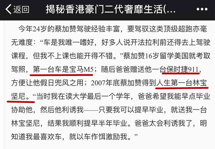 蔡加赞台车是宝马M5,之后得到一台保时捷911用来兜风,大学的时候,父亲为了奖励他提早半年毕业,送了一辆兰博基尼: