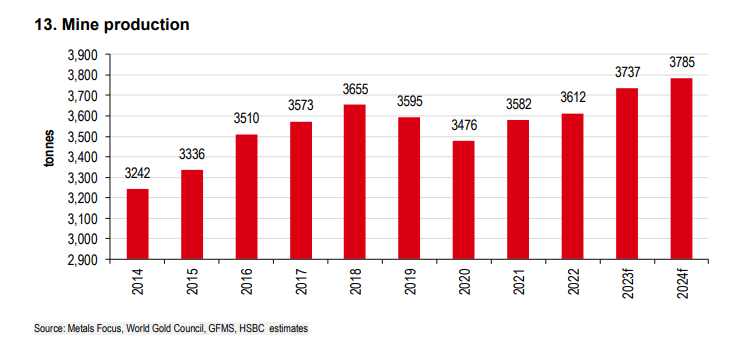 金矿开采面临的真正挑战可能在2025年之后,随着新项目数量下降,新生产将越来越不足以抵消矿石品位下降和储量枯竭,汇丰将2023年的预测从3757吨削减至3737吨,并将2024年的产量预测从3800吨下调至3785吨。
