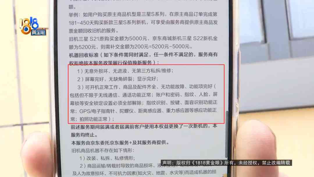 魏师傅:2022年在京东自营里面买了一部手机,它里面就推出了一个,全额保值换新服务。我们是额外要自己掏50块钱的,就是买这个服务。一年之后我们就到期了,要去旧机经过检测回收,换新手机。但是京东他们检测之后,他就说我这个手机,有轻微的磨损,跟轻微的掉漆。