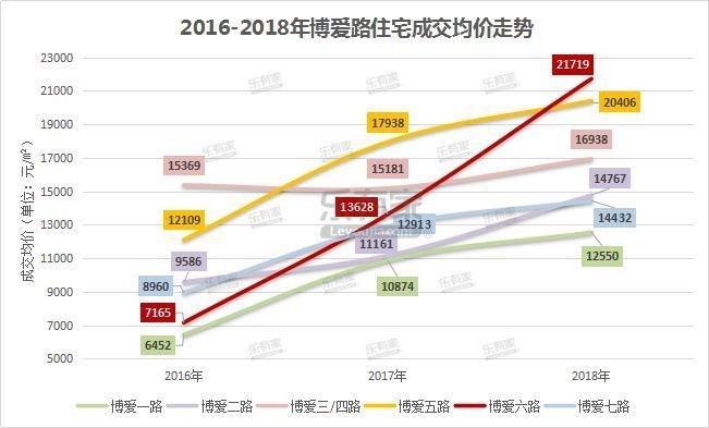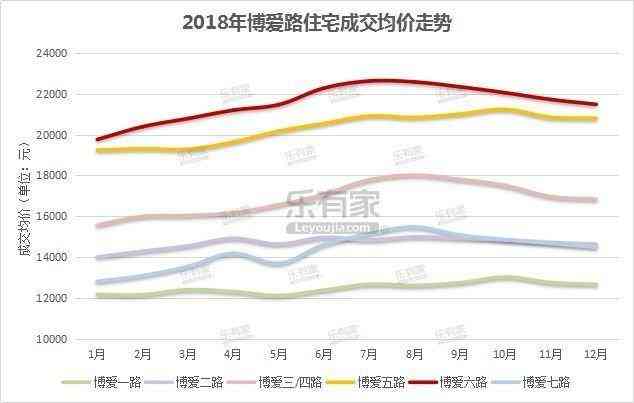乐有家研究中心数据显示,从2018年博爱路各路段二手住宅成交均价走势来看,博爱六路房价最高,成交均价约21553元/㎡;博爱五路紧随其后,成交均价约20315元/㎡;前半年博爱二路房价略高于博爱七路,后半年两路段房价几乎持平;成交均价最低路段为博爱一路,约12506元/㎡。