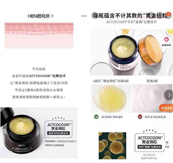 另据财经网产经对比,HBN不仅修改了官网的专利页面。在ACTCOCOON黄金微粒的形容中,将原先公众号推文中的“专利包裹技术”一词,在电商页面改为“专研‘蚕蛹’包裹技术”。原先展示的“活性持久记录保持者”措辞以及相关可追溯至申请人广东芭薇的“微凝珠抗衰精华液”专利号也被隐去。