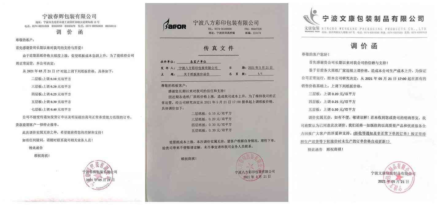 5月21日,就在各大纸厂宣布涨价后,宁波市十多家知名纸板厂宣布涨价,涵盖各类纸板规格。 例如,宁波春辉包装有限公司、八方彩印包装有限公司、文康包装制品有限公司等,纷纷上调一-七层板0.1-0.4元/双平方。