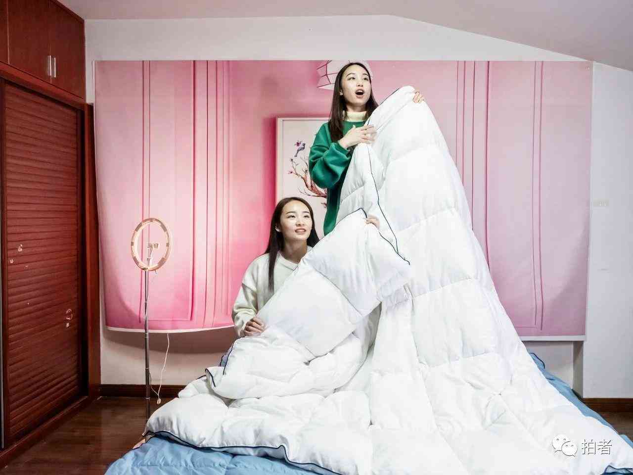 △ 芸糖朵朵(图左)和野小文(图右)姐妹站在床上直播卖被子。她们过去在四川老家从事房地产销售,芸塘朵朵说,做过销售的人,抗压力都强,面对镜头都有成熟的话术。