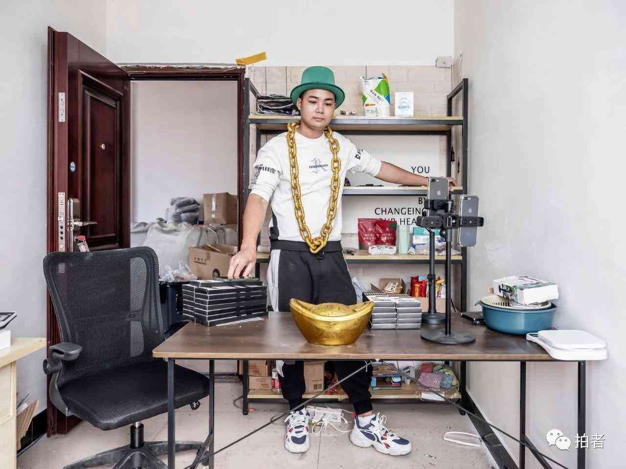 △ 24岁的郑建涛戴着绿色的帽子和金色的锁链站在直播间。他说,“早上起来,就听到刺啦刺啦的声音,可惜这个声音不属于我,太好听了,我知道这是又有主播爆单了,撕胶带装包裹的声音是最美的声音”。郑建涛,江西人,来江北下朱村3个月,之前做汽修行业,现在做直播带货主播。