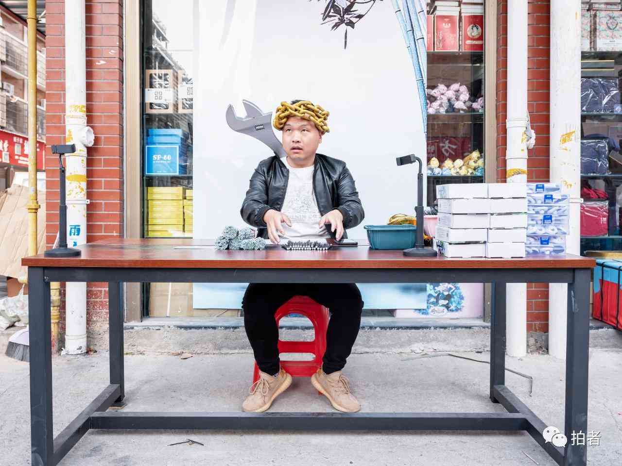 △ 30岁的一鸣头戴金锁链,身背扳手道具,坐在一商户门前拍摄短视频。一鸣来自河北邯郸,他说刚来的时候,不好意思拍,现在想通了,要在义乌好好干一场,挣不到钱不回家。