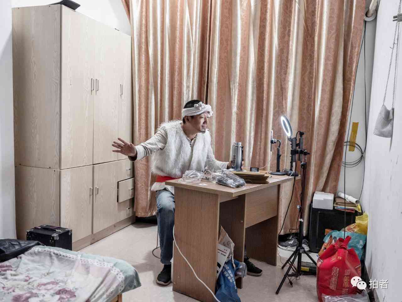 △ 44岁的王贺进,安徽阜阳人。他身穿白羊肚马甲,头戴白毛巾,腰间系着一根红绸带,坐在租住的房间直播带货。之前他在瑞丽做翡翠生意,受疫情影响,转行做主播。他说有两个儿子,不干不行。